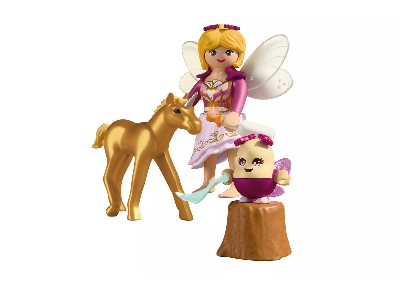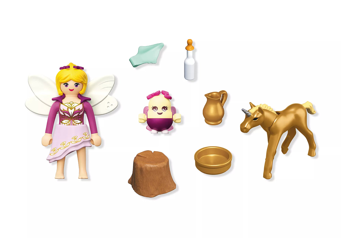 A golden miracle has arrived in the Unicorn Kingdom! With twinkling eyes and a shimmering coat, the Golden Unicorn Foal is lovingly cared for by a gentle fairy and her happy Joyling helper. From bottle feeding to cuddles on a little tree stump, every moment is filled with warmth and wonder. This charming PLAYMOBIL playset features magical accessories like a carafe, milk bottle, and sparkling fairy wings. Perfect for storytelling and enchanted play, children can create their own fairy-tale adventures with this magical PLAYMOBIL playset!