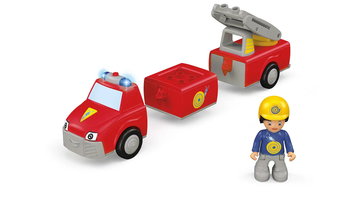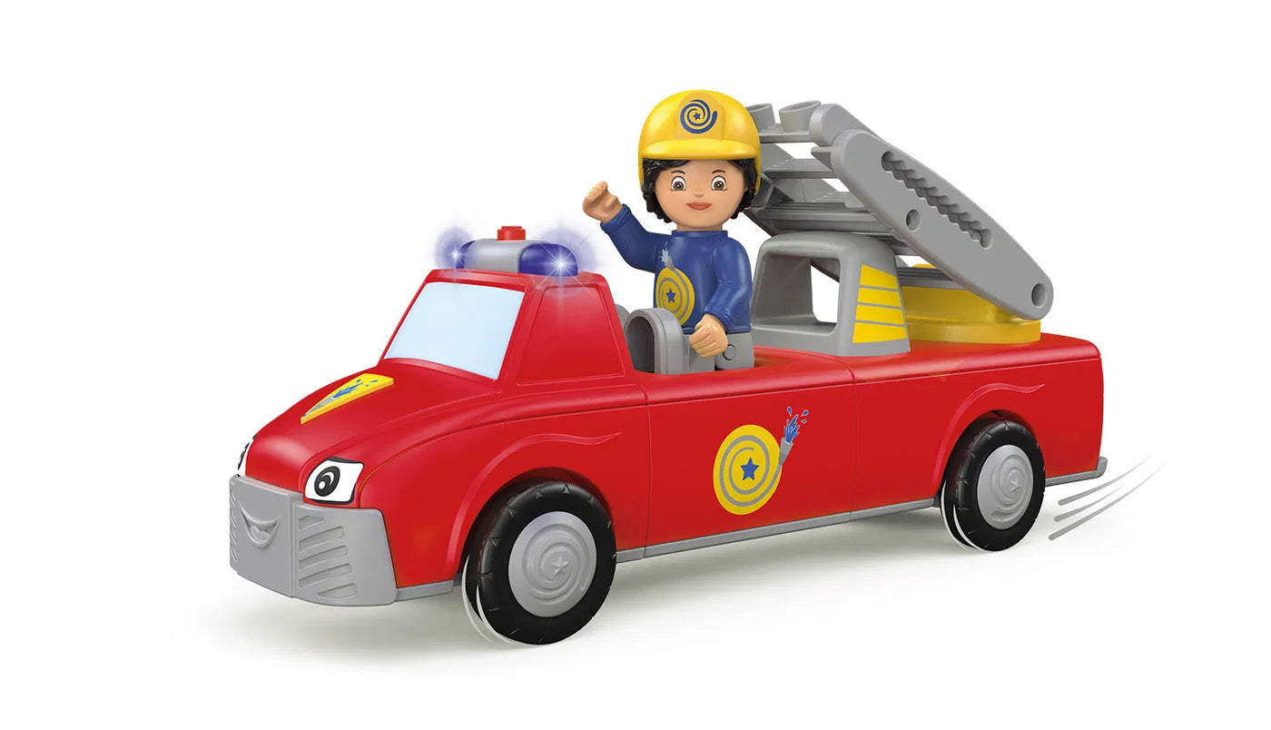 Nee naw, nee naw – Fire!!! Help is on its way. In no time at all Harry in his helmet and the bright red Helpy dash with blue lights flashing and sirens wailing to the scene of the fire. At the scene, the two take a quick look. Harry jumps out of the fire engine and immediately organises putting the fire out. Oh dear, not everyone escaped from the house in time. Quickly now! Helpy gets as close as he can to the house, and then the big turntable ladder is positioned and extended. Harry clambers up the ladder in order to save the little cat from the flames. She’s afraid, but he puts her carefully under his arm and carries her down the ladder to her friend. Phew – we managed it! There’s just a few flames left to put out, and then everyone is safe.