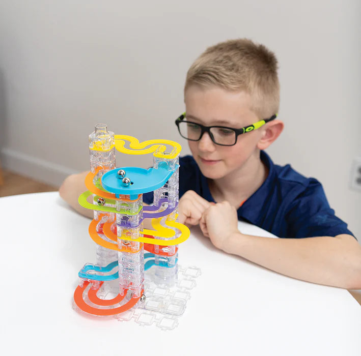 Unleash engineering-magic and creative marble motion with this dynamic build-and-run experience. Designed for ages 8 and up, this 73-piece kit from Fat Brain Toys invites kids to explore cause & effect, spatial reasoning, and design thinking—all while constructing a spectacular marble run.