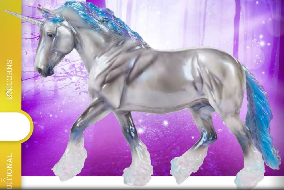 • Thorin's shaded grey coat, accented with a blue interference finish and high-gloss shine, captures the beauty of stormy skies. Purple and blue hues in his mane, tail, and leg feathering make this unicorn truly unforgettable.