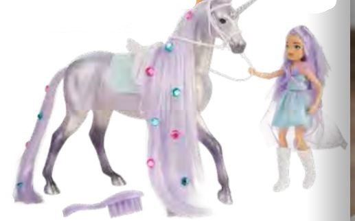 • This set features a 5.75* articulated doll, 12 repositionable hair gems, hairbrush, unicorn, saddle, bridle, and saddle pad.